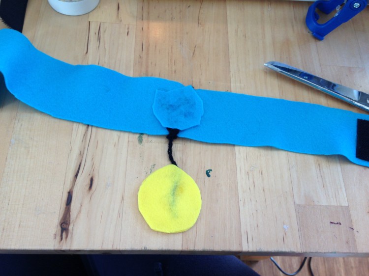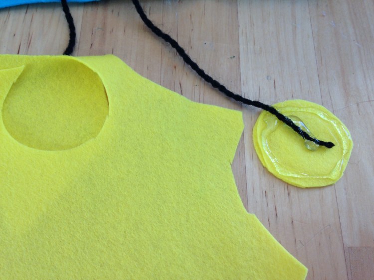 Il collarino è stato il tocco finale ed ho utilizzato una striscia di panno celeste ad una estremità del quale ho incollato un pezzetto di velcro. Basta mettere solo il lato ruvido perché poi rimane attaccato al panno senza bisogno di mettere il lato morbido del velcro. Per la medaglietta ho utilizzato il giallo ed ho incollato in mezzo un filo nero per tenere la medaglia attaccata al collarino