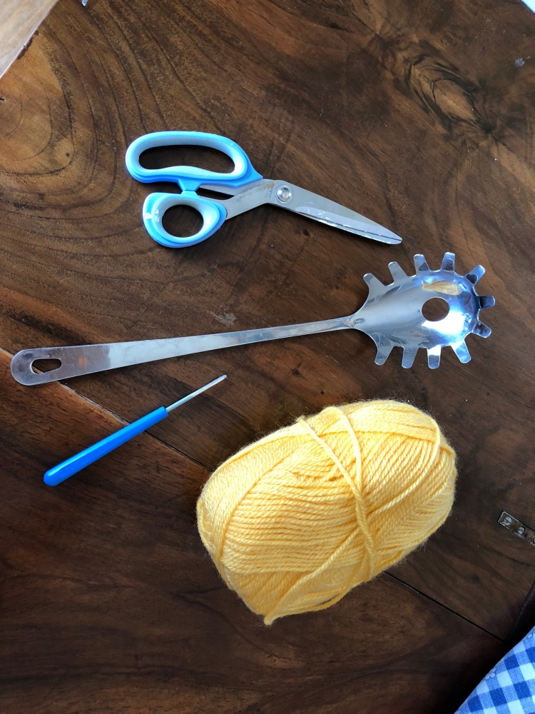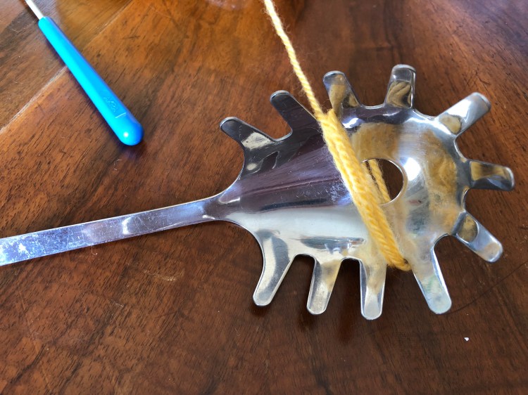 Prendere un mestolo da cucina, di quelli per servire la pasta (importante deve avere il foro nel mezzo), della lana, un uncinetto e un paio di forbici