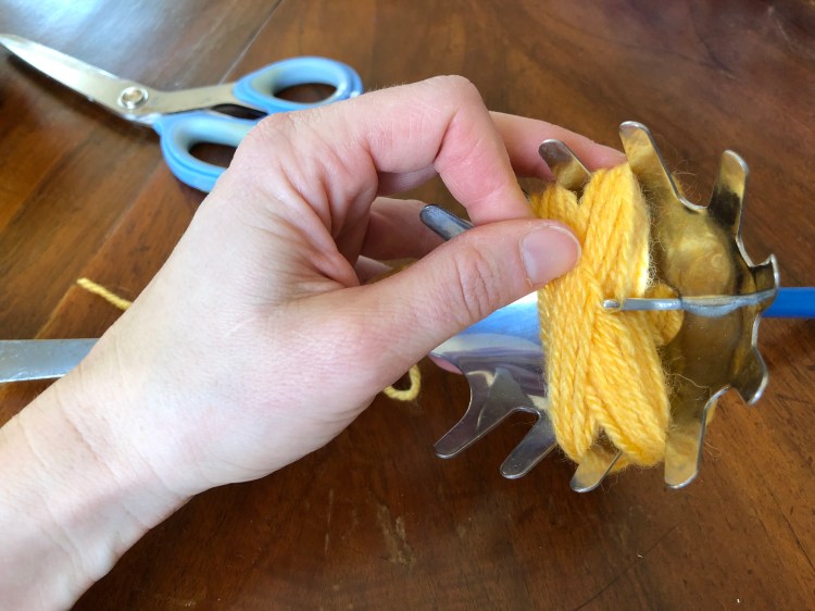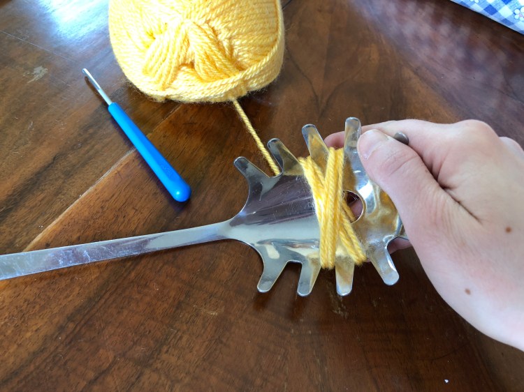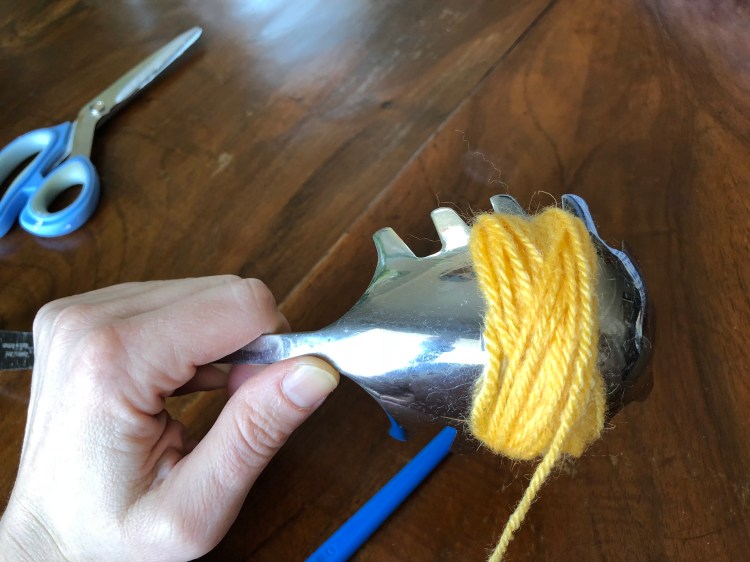 Iniziare ad arrotolare la lana sul mestolo in corrispondenza del centro, dove c’è il foro. Intorno ai denti centrali incrociando