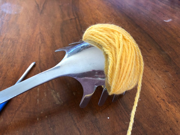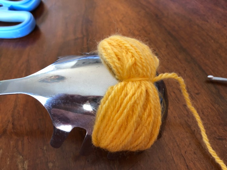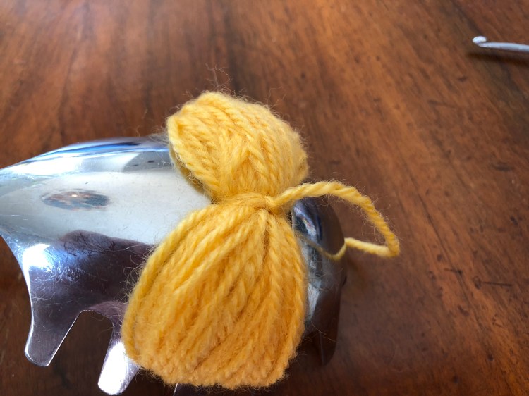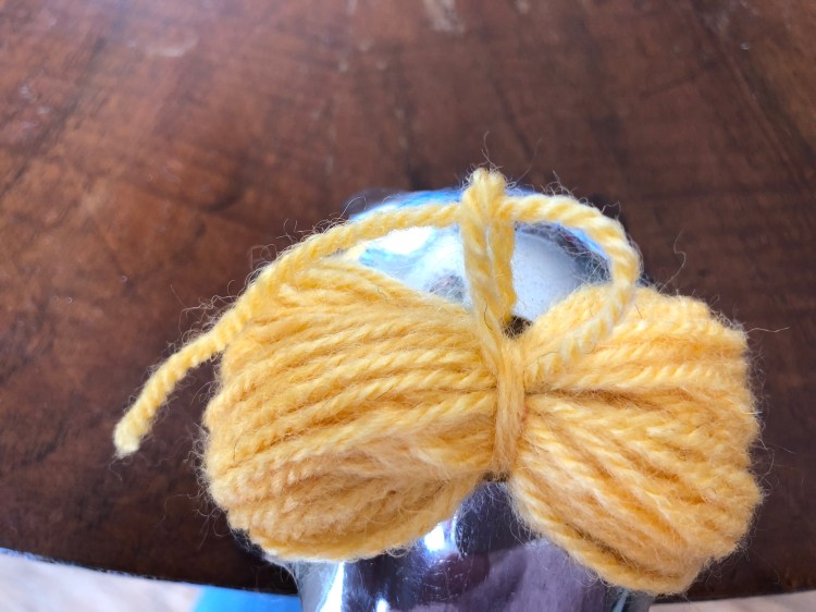 Una volta deciso di aver fatto abbastanza giri con la lana si taglia il filo. Si prepara un uncinetto e si fa passare il filo attraverso il foro intono alla lana e si stringe stretto stretto con un paio di nodi