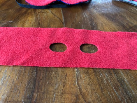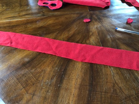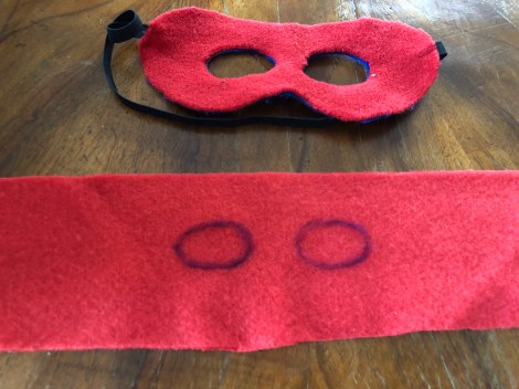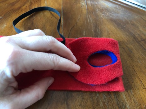Prendendo a modello la mascherina da Super eroe, ho ritagliato l’apertura per gli occhi in mezzo alla striscia di pile rosso